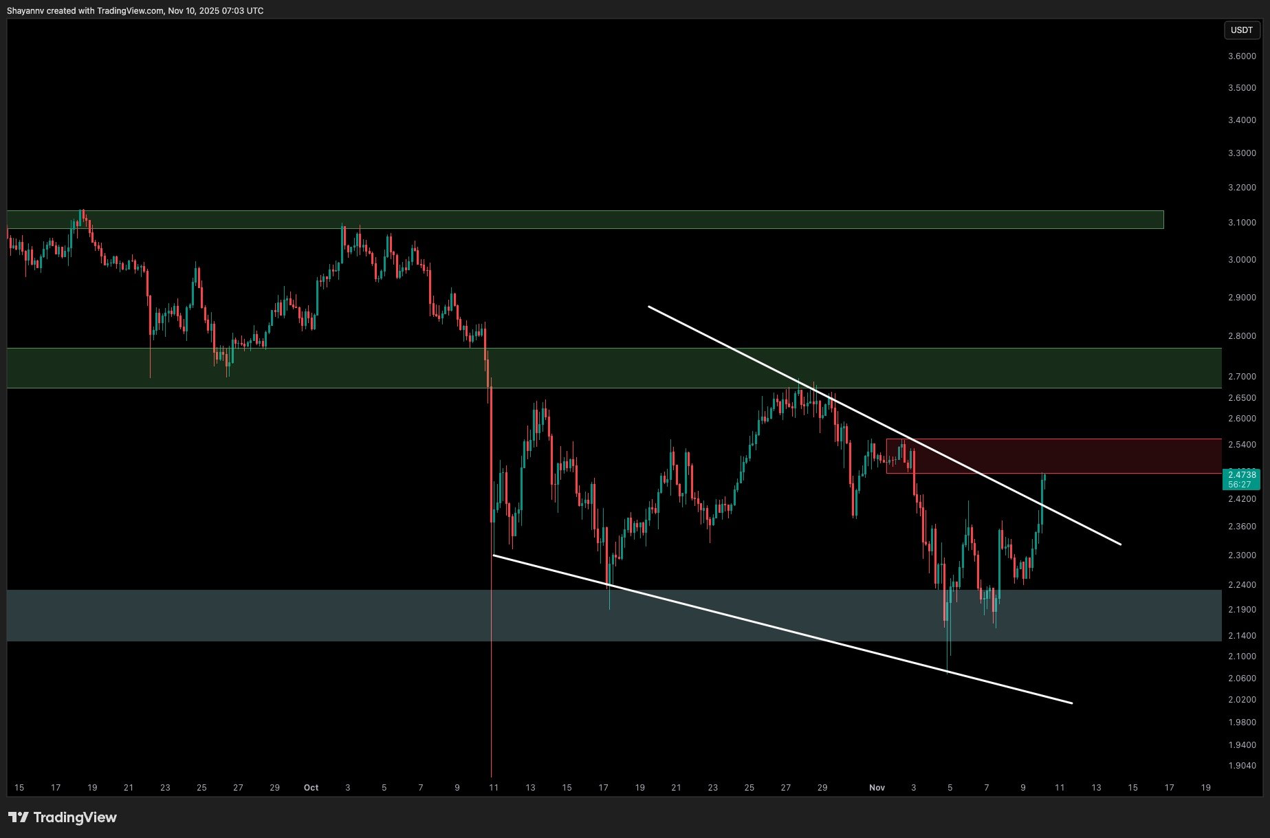 This formation reflects a classic breakout-retest pattern occurring after a prolonged compression phase, but confirmation is reliant on XRP’s behavior around the $2.5 pivot.