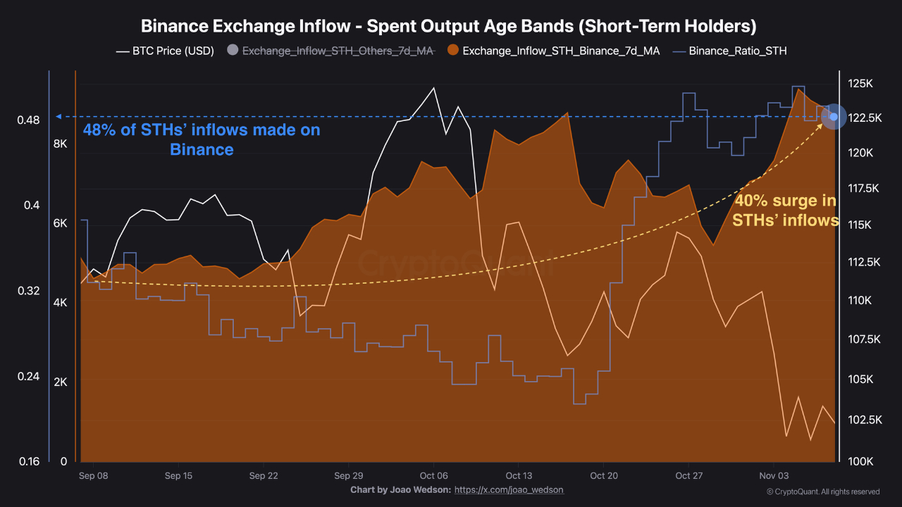 Over the past month, the SSR slipped from 15 to 13 while BTC lingered around $105,000, suggesting buyers are biding their time until they receive confirmation for investment. Conversely, a 40% increase in short-term holder (STH) deposits to Binance has been observed, indicating increased selling pressure.