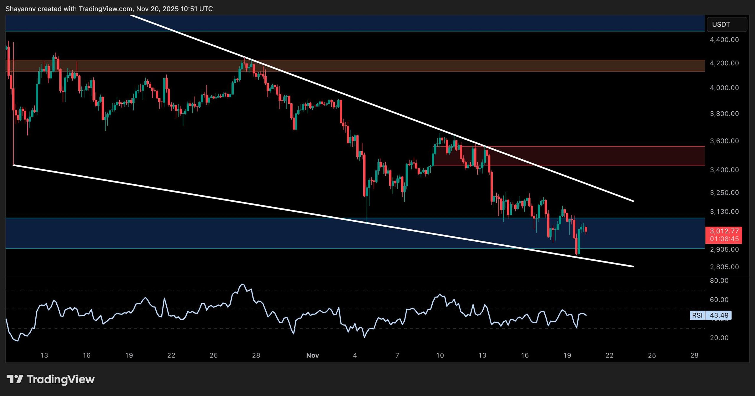 On the 4-hour chart, ETH is currently in a falling wedge pattern, typically a precursor to a reversal, though a breakout has not yet materialized. The price is testing the lower trendline of this wedge while trying to remain above $3,000.