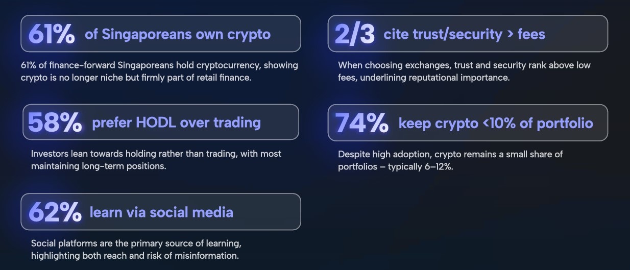 The survey revealed that Singapore’s crypto ecosystem is evolving, with a focus on regulated exchanges and security rather than merely seeking the cheapest option. Conducted among 3,513 retail investors, the results show that 58% consider themselves long-term holders, and 42% have maintained their investments for over two years.