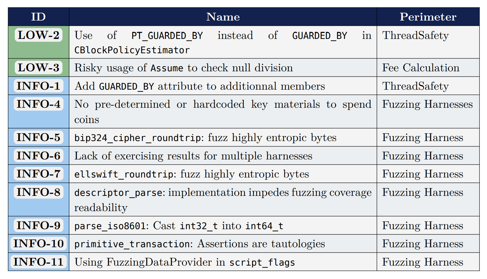 Reviewers found that there were no high- or medium-severity security flaws, highlighting only two low-severity issues along with suggestions for improvements mainly related to fuzz testing and code coverage. No significant findings were reported that could disrupt consensus, deny service, or invalidate transactions.