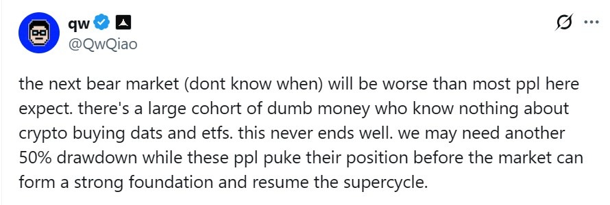 “There’s a large cohort of dumb money who know nothing about crypto buying DATs and ETFs. This never ends well,” said QwQiao, co-founder of Alliance DAO.