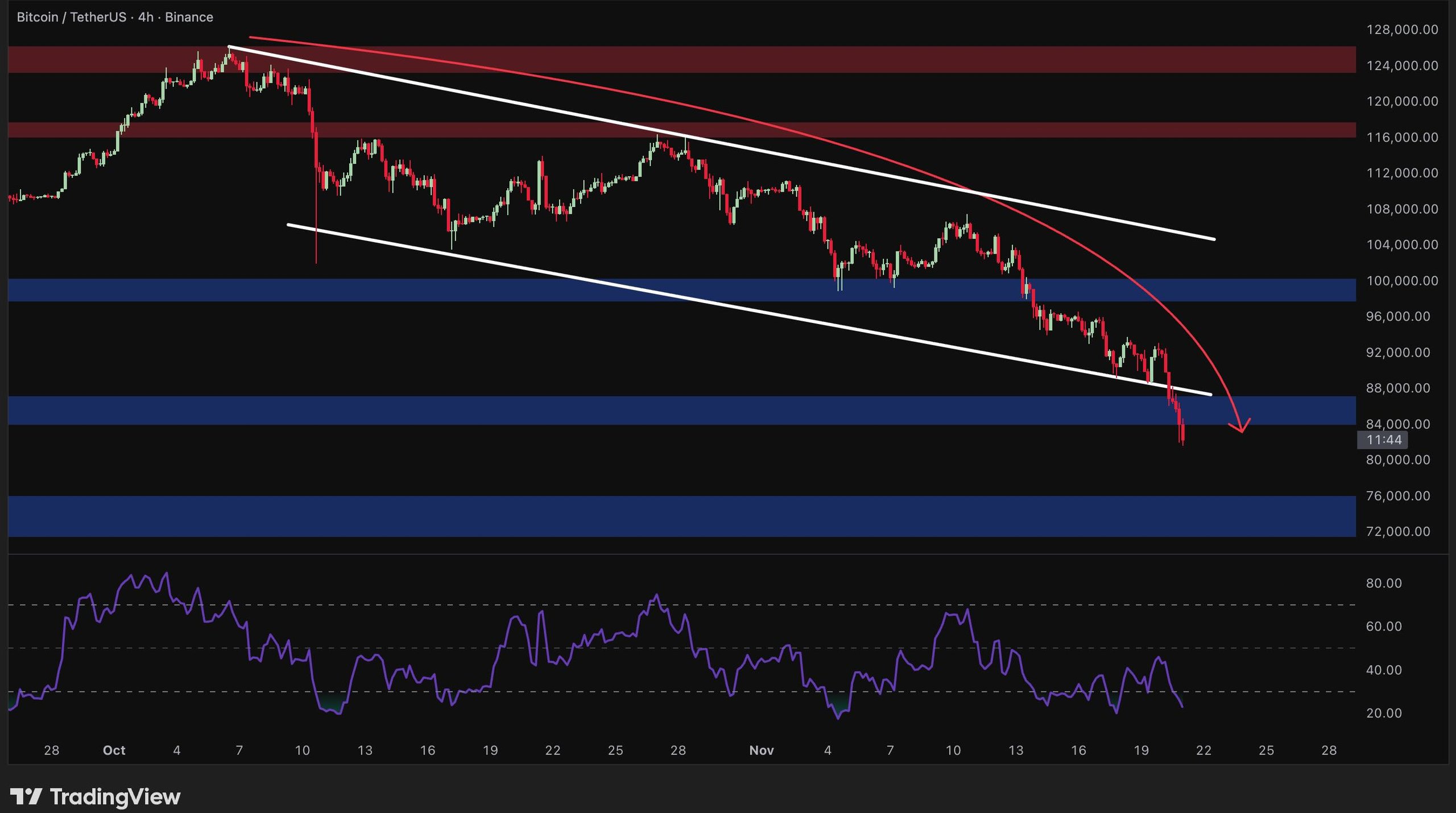 Analyzing the 4-hour chart, BTC has confirmed a downward trend within a well-defined descending channel. The most recent drop below this range signals increasing seller momentum, although previous attempts at recovery have proven weak and fleeting, evidenced only by brief candle wicks. Any efforts to rebound towards the $85K mark may now encounter resistance, as this level has been breached downward. Currently, with the RSI near 20, the likelihood of further bearish momentum remains intact unless a significant volume-driven price recovery occurs.