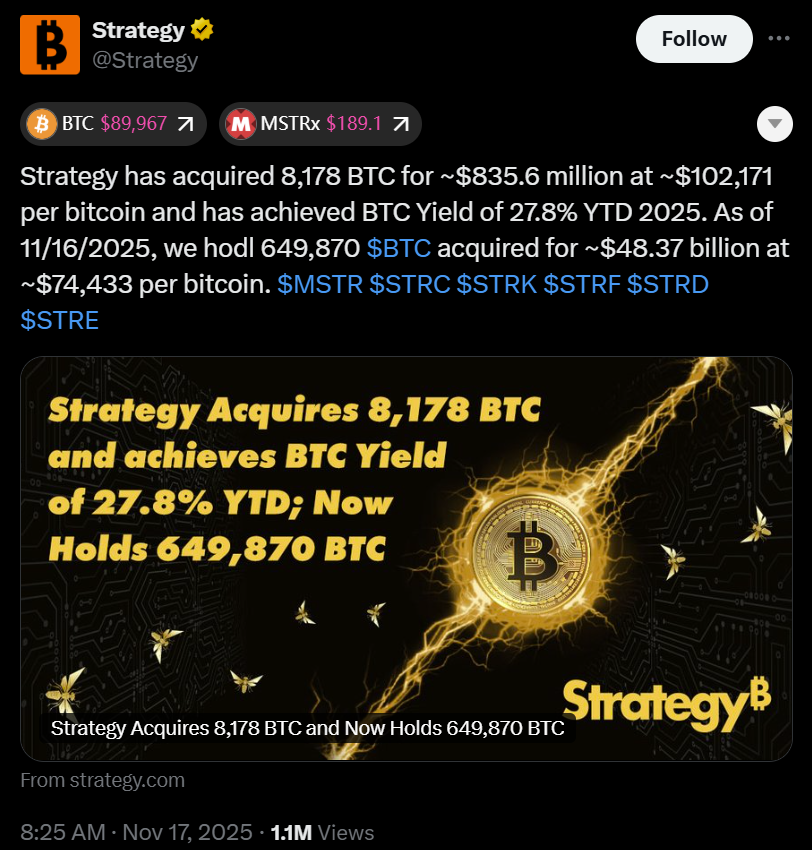 Strategy, the business-intelligence firm turned Bitcoin supporter, made headlines this week by acquiring an additional 8,178 BTC for $835.6 million at an average price of $102,171 per Bitcoin. This acquisition marks the largest for the company since July.