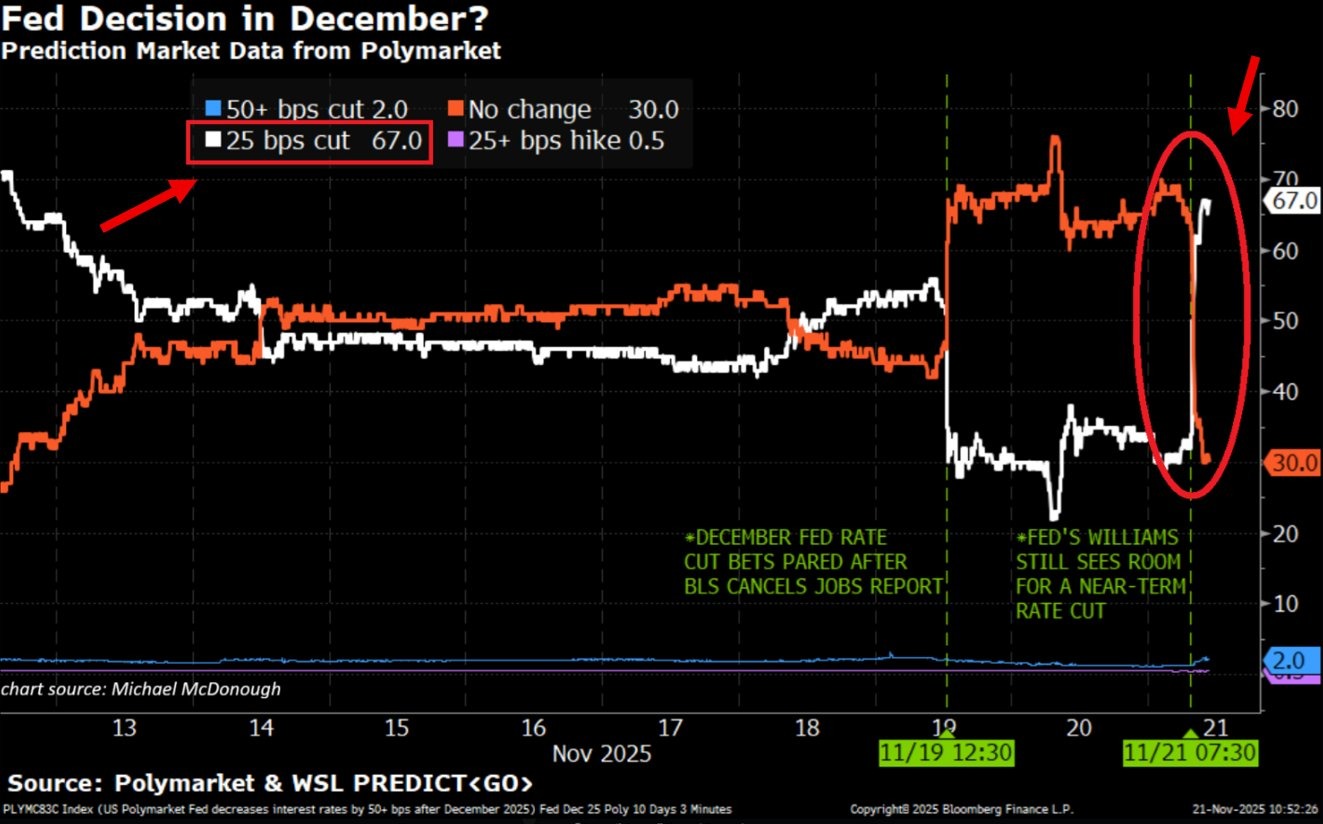 The likelihood of a Federal Reserve rate cut in December has fluctuated around 30% last week before climbing back to 70%, according to Edwards.
