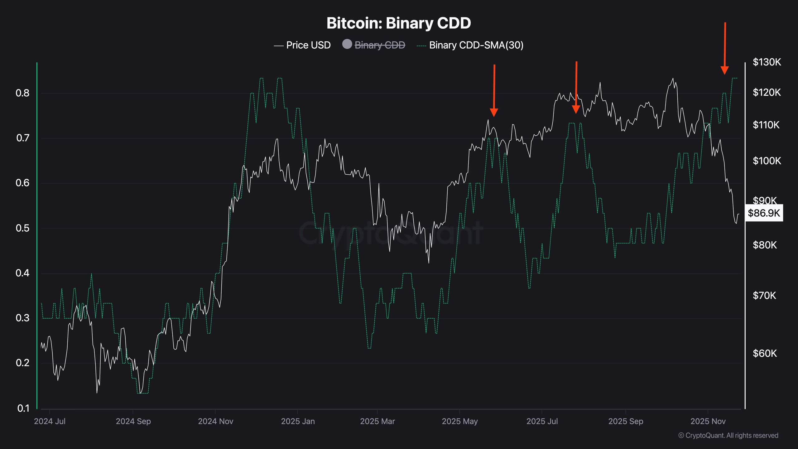 Bitcoin’s Binary CDD indicates a substantial change in behavior among long-term, savvy investors. The marked upward spikes denote points where experienced holders decided to offload BTC into bullish phases, while retail interest was increasing. Each spike parallels local or macro peaks, confirming a reactivation of dormant supply at premium rates.