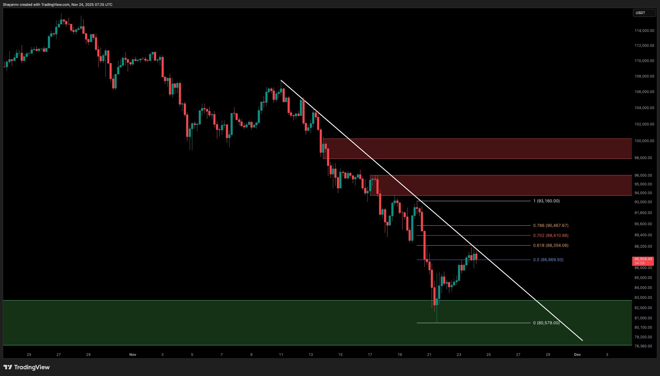 The latest drop to around $80K demonstrates that liquidity beneath previous macro lows has been depleted. Buyers reacted firmly at the lower boundary of the green accumulation zone, but the bounce remains a correction. As long as the market operates below the $92K–$96K supply area, this rise should be regarded as temporary relief within an overall downtrend.