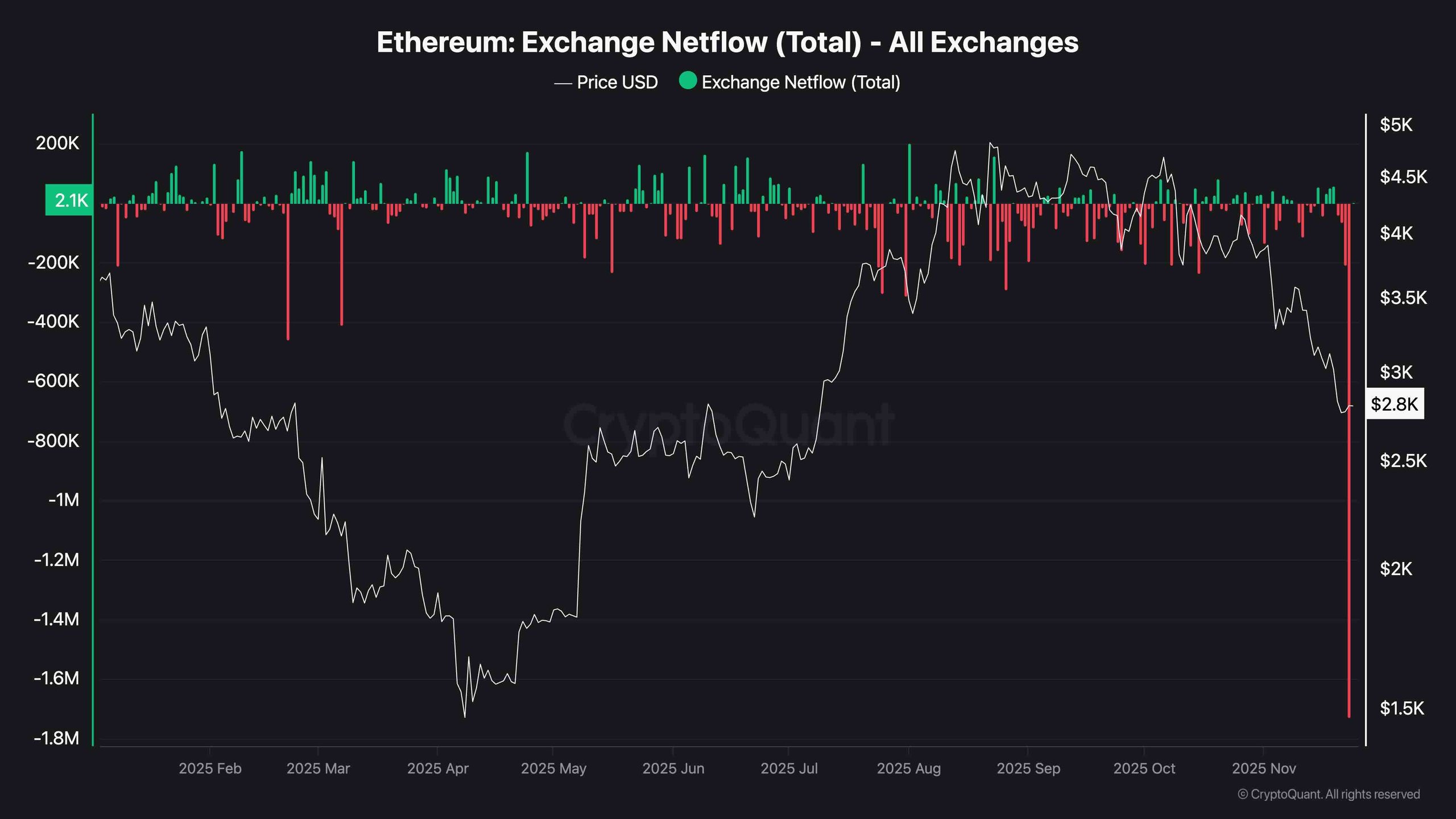 On November 23rd, Ethereum witnessed a notable uptick in outflows from exchanges, marking one of the largest negative netflows in years. A substantial volume of ETH was drawn from centralized platforms, which may indicate that large holders (whales) or institutions are transferring assets to cold storage amid market weakness, seeking accumulation opportunities or long-term retention. Alternatively, this behavior might reflect users seeking to mitigate custodial risks amid fears of further downturns.