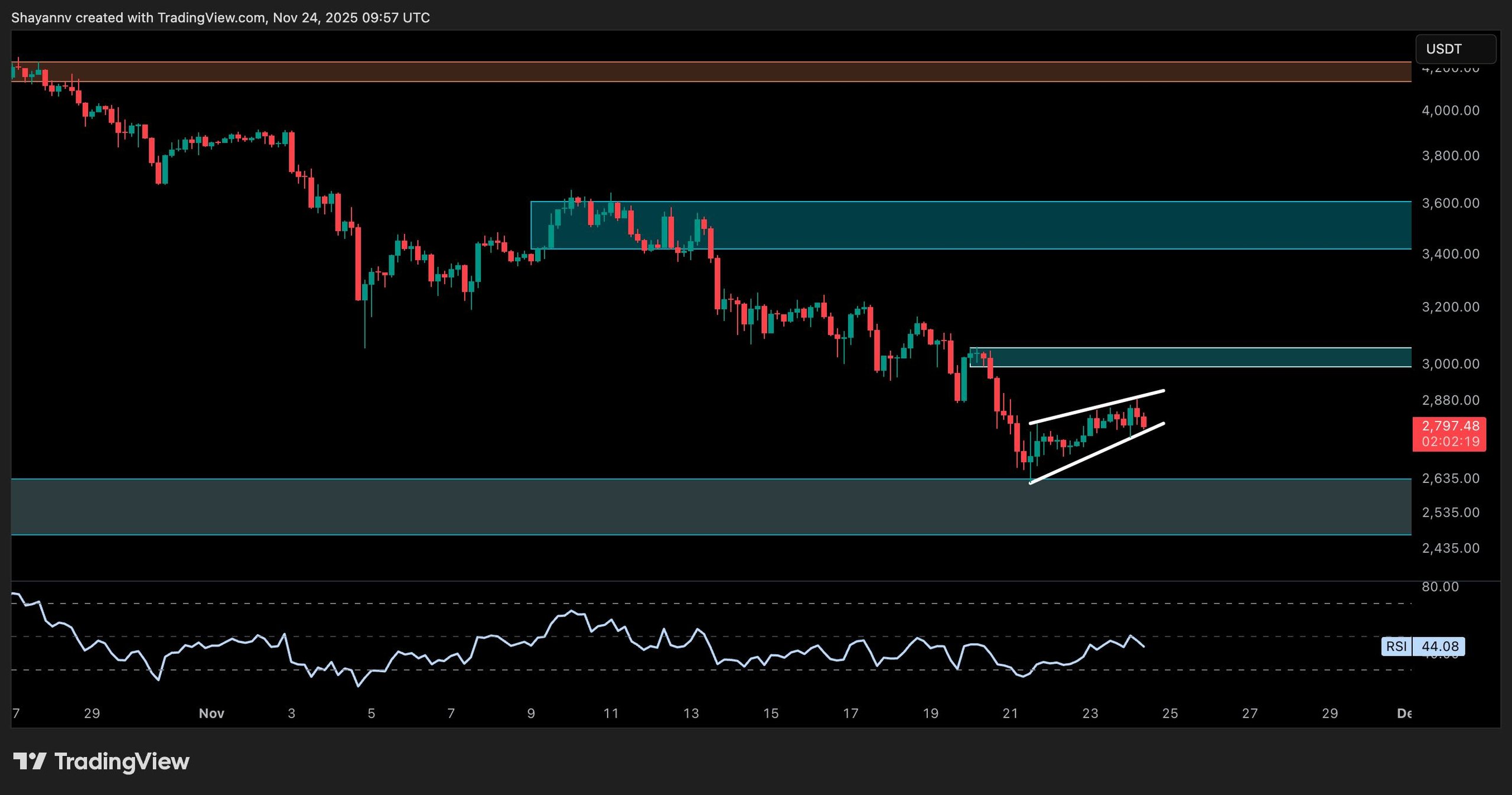 - The RSI is currently hovering around 30, indicating a deeply oversold condition and signaling robust bearish pressure. Should Ethereum fail to reclaim the $3,000-$3,100 range shortly, the next significant barrier will likely be around $2,500—a previously established demand zone.