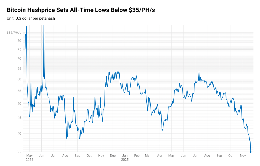 This decline follows a stable third quarter where the average hash price stood around $55/PH/s, aided by Bitcoin trading near $110,000. Increased competition coupled with the slipping Bitcoin price in November has resulted in historically low mining profitability.