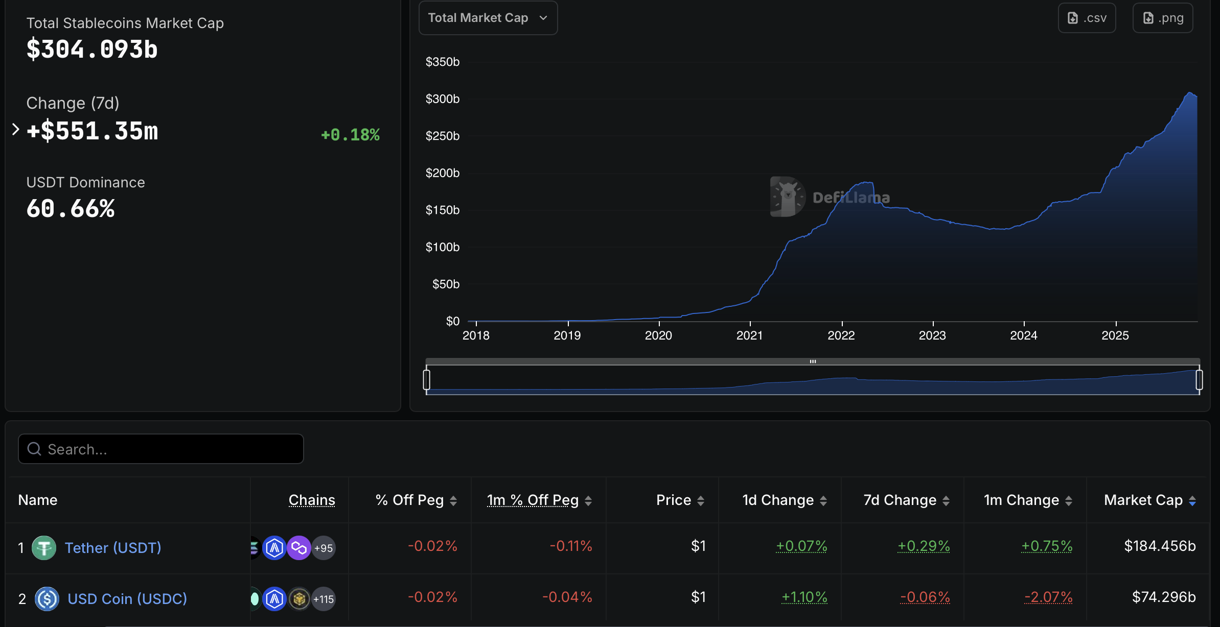 Currently, the overall stablecoin market is approximately valued at $304 billion, with Tether (USDT) leading at $184 billion, followed by Circle’s USDC at $74.3 billion, according to data from DefiLlama.