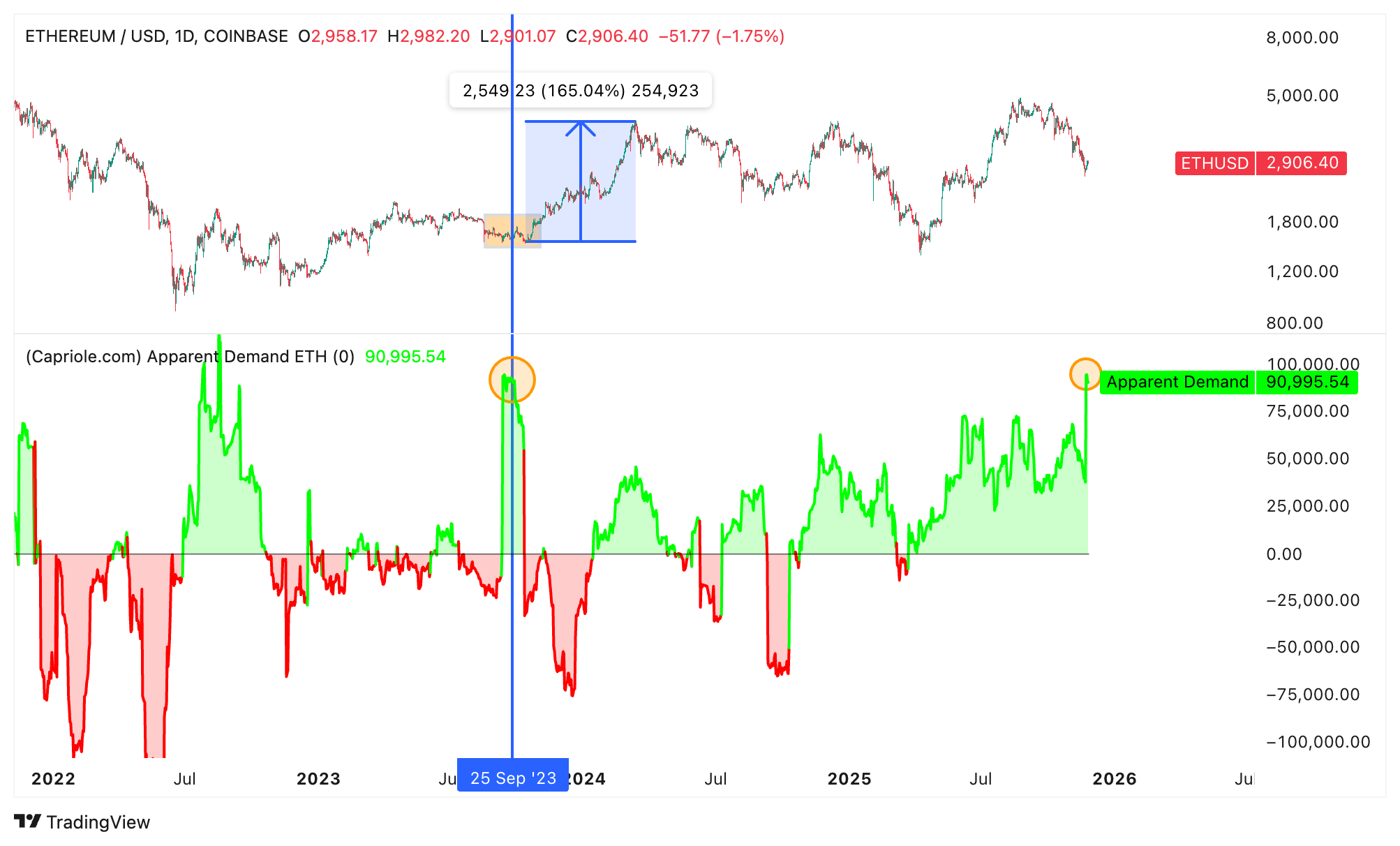Ethereum demand is reportedly recovering alongside increased ETF inflows. On November 26, the apparent demand for ETH surged to 90,995 from 37,990 on November 22. This indicates aggressive accumulation during price dips, hinting at an imminent price rebound.