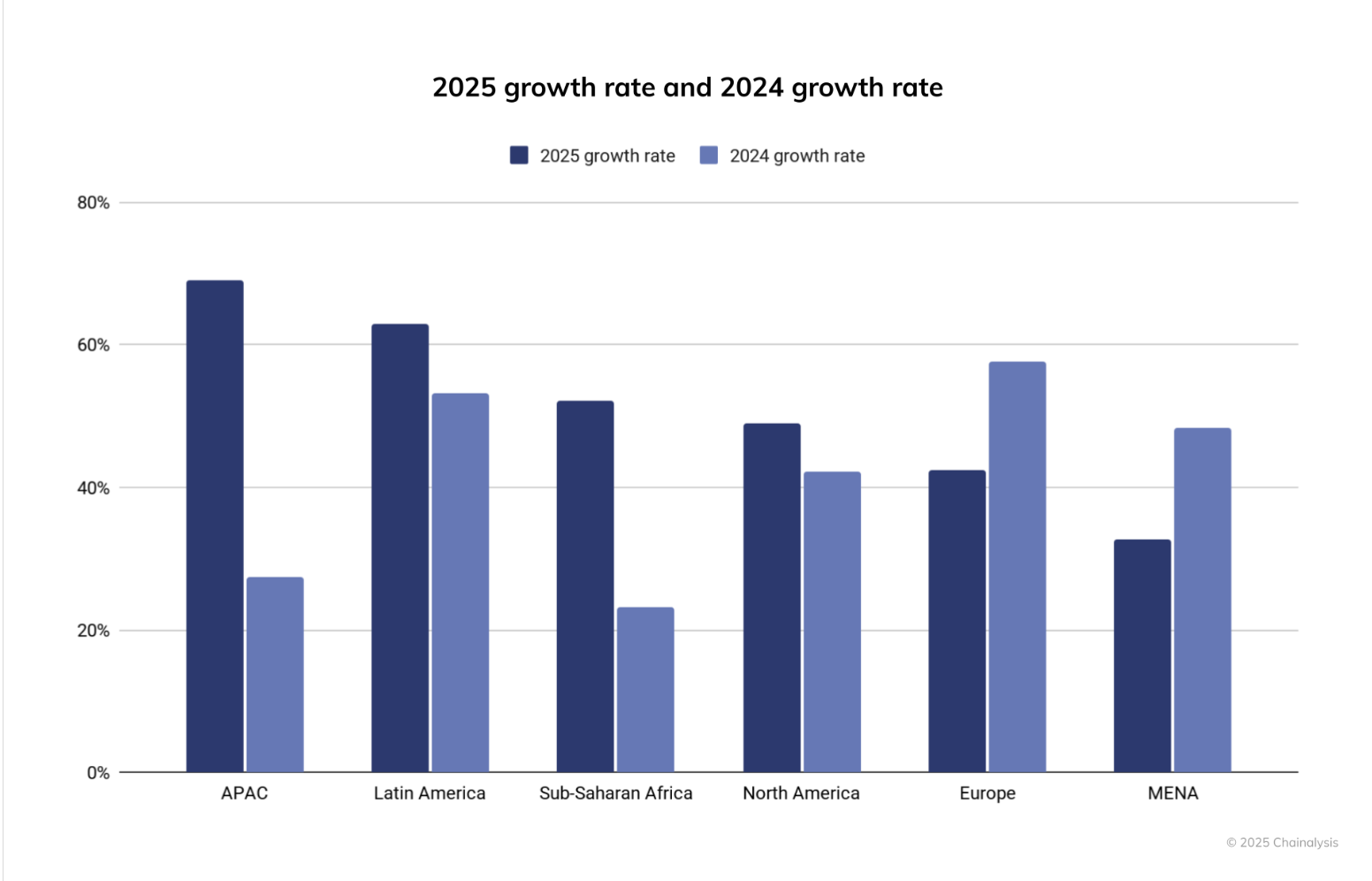 The growth rate of crypto adoption by geographic region in 2024 and 2025. Source: Chainalysis