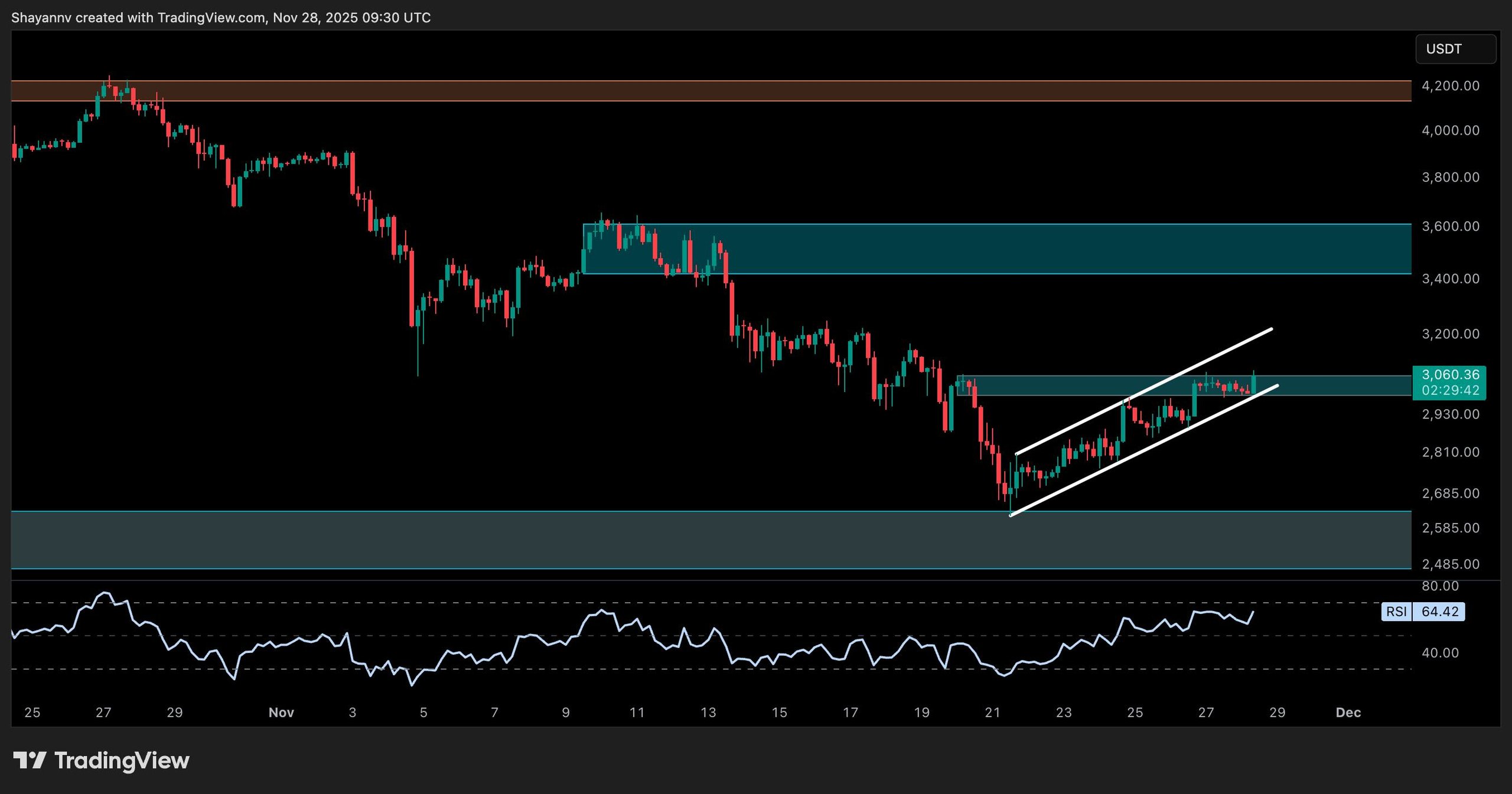 Conversely, if the flag descends, the immediate level to monitor is the $2,800 short-term low. An inability to maintain that zone could trigger further declines to the $2,500 demand zone.