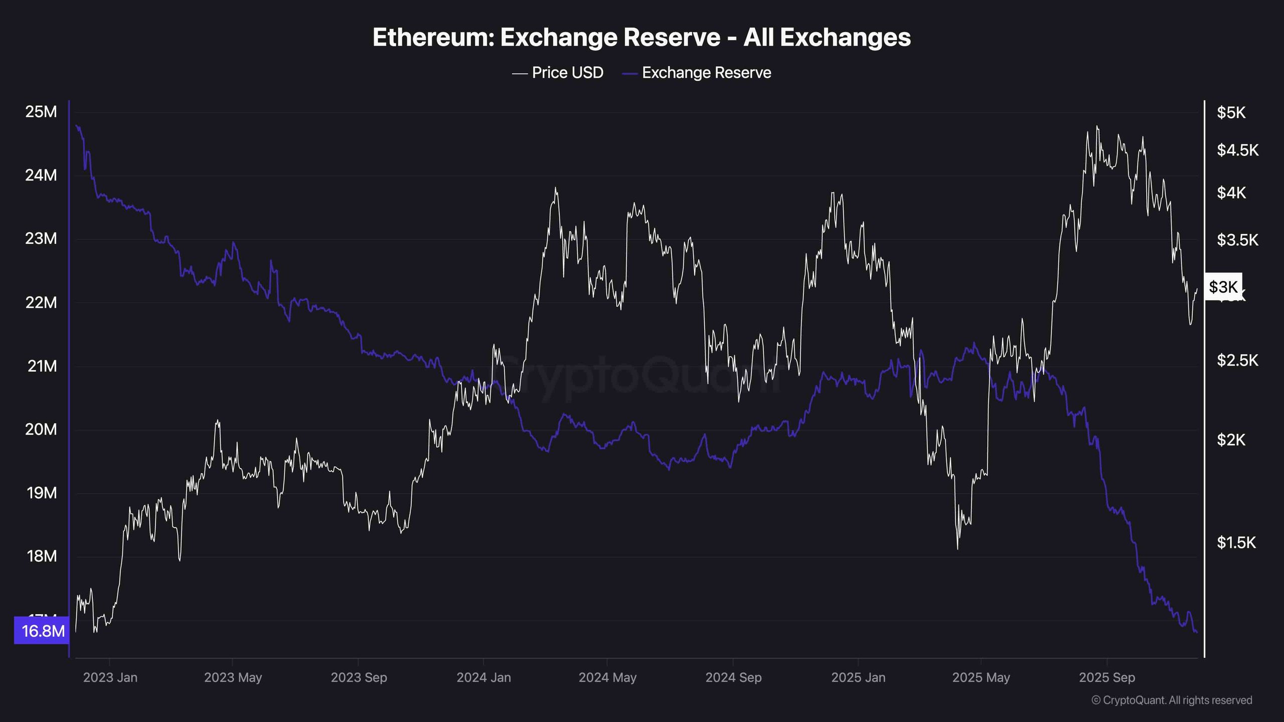 From an on-chain viewpoint, Ethereum’s exchange reserves are on a steep decline, reaching a multi-year low of approximately 16.8 million ETH. This ongoing outflow from trading platforms signals a robust long-term bullish sentiment, as investors are increasingly opting to transfer their assets into cold storage or staking instead of making preparations to sell.