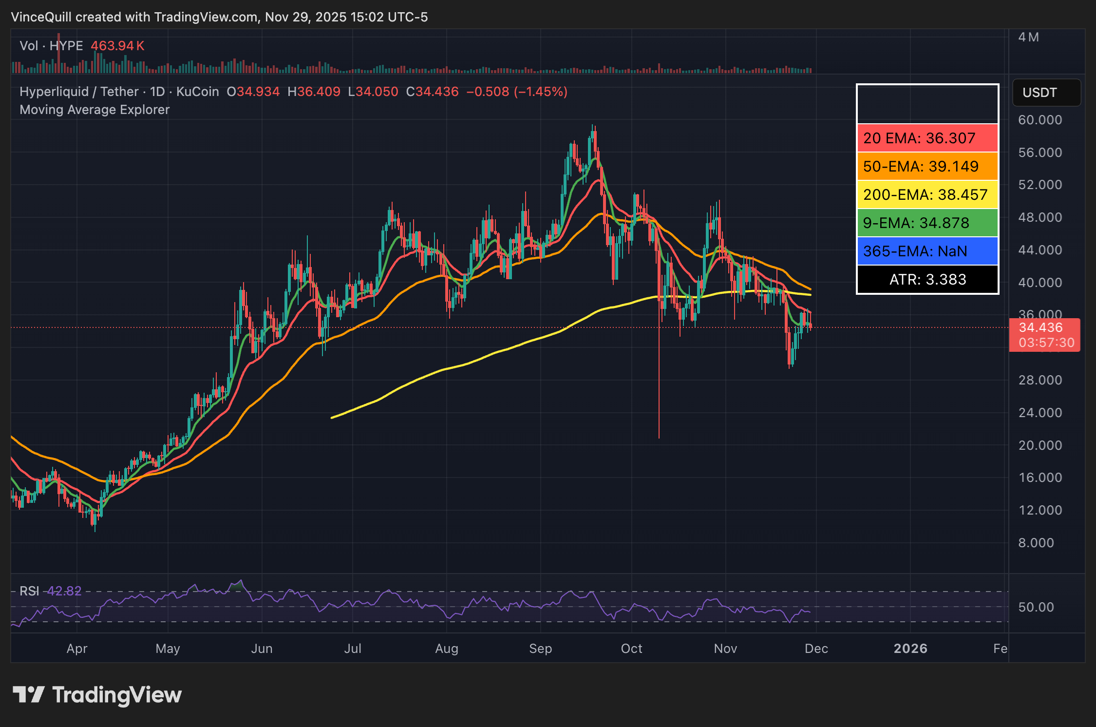 Following a high of around $59.40 in September, HYPE has experienced a drop of approximately 42%, trading predominantly below its 200-day moving average—a critical support level.