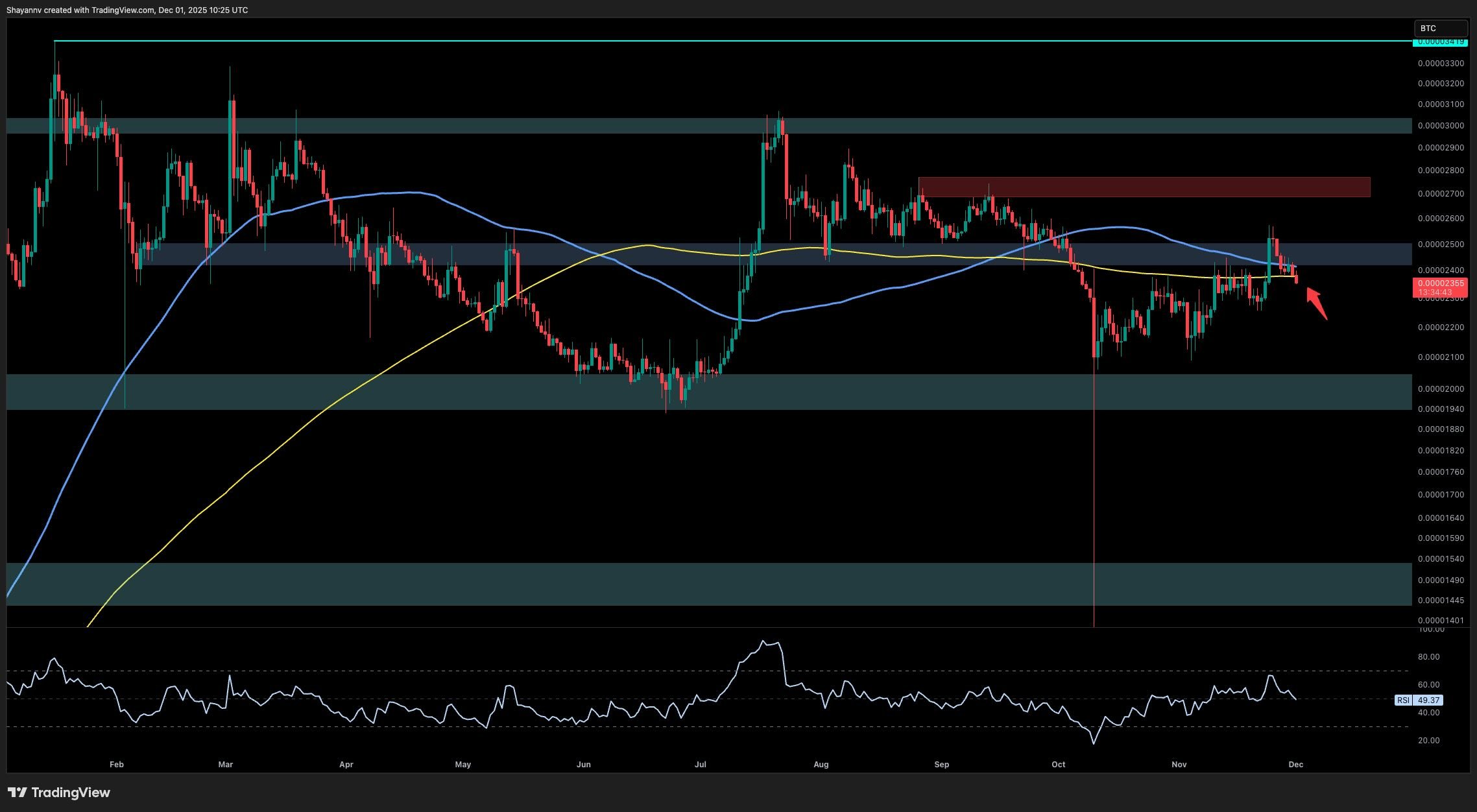 If XRP closes back under this significant area, it could indicate a deviation with a potential downside target of 2,000 SAT. Conversely, to regain bullish momentum, XRP needs to reclaim and maintain a position above 2,500 SAT.