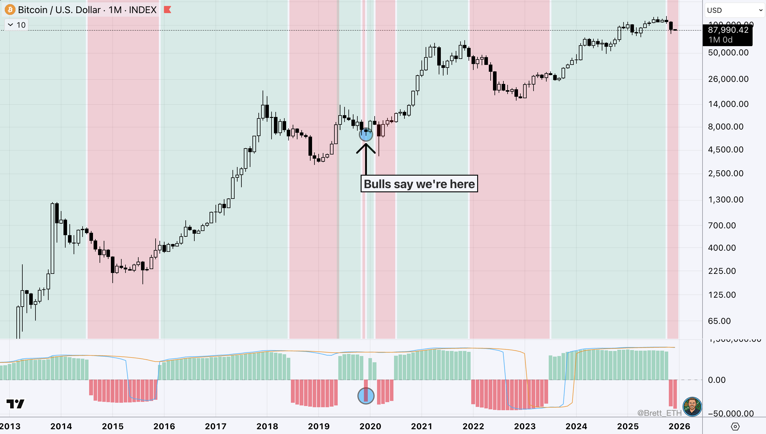 October marked the first occurrence of Bitcoin’s monthly MACD entering bearish territory in this bull cycle. In analysis presented by trader Brett, it was noted that similar signals in the past have often preceded approximately 50% price drops before establishing new lows.
