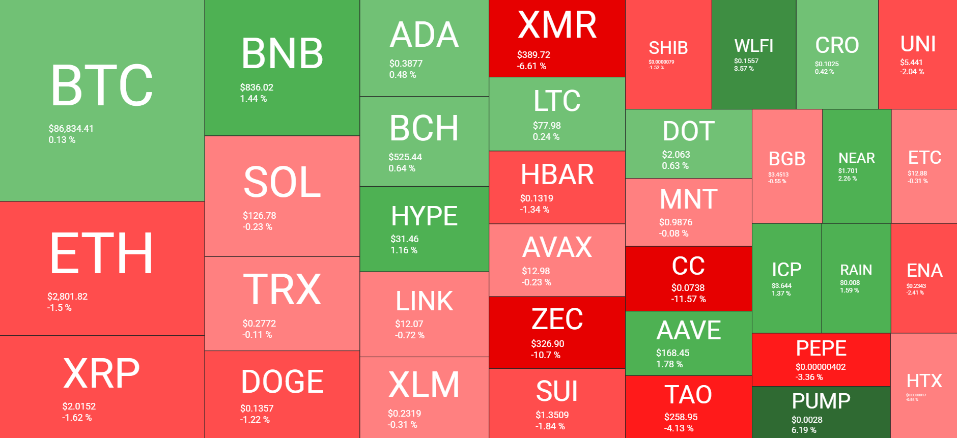 Other altcoins followed suit, with ETH dropping to $2,800 and XRP challenging the significant $2.00 support line. ZEC, along with XMR and CC, experienced sharp losses over the past 24 hours.