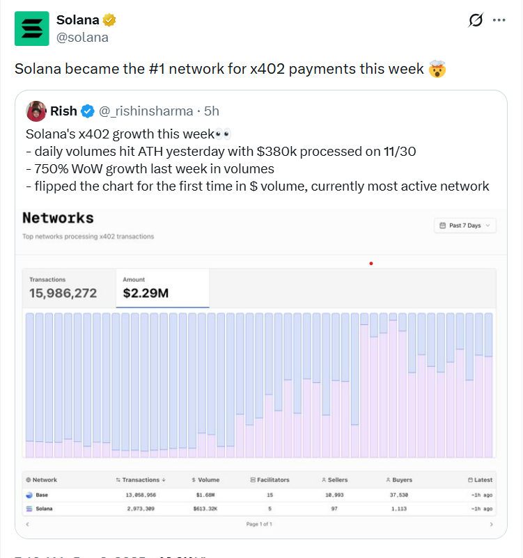 For Solana, establishing itself as the top venue for x402 payments reinforces its proposition that low fees and high throughput are beneficial not just for speculative trading but also for machine-driven micropayments.
