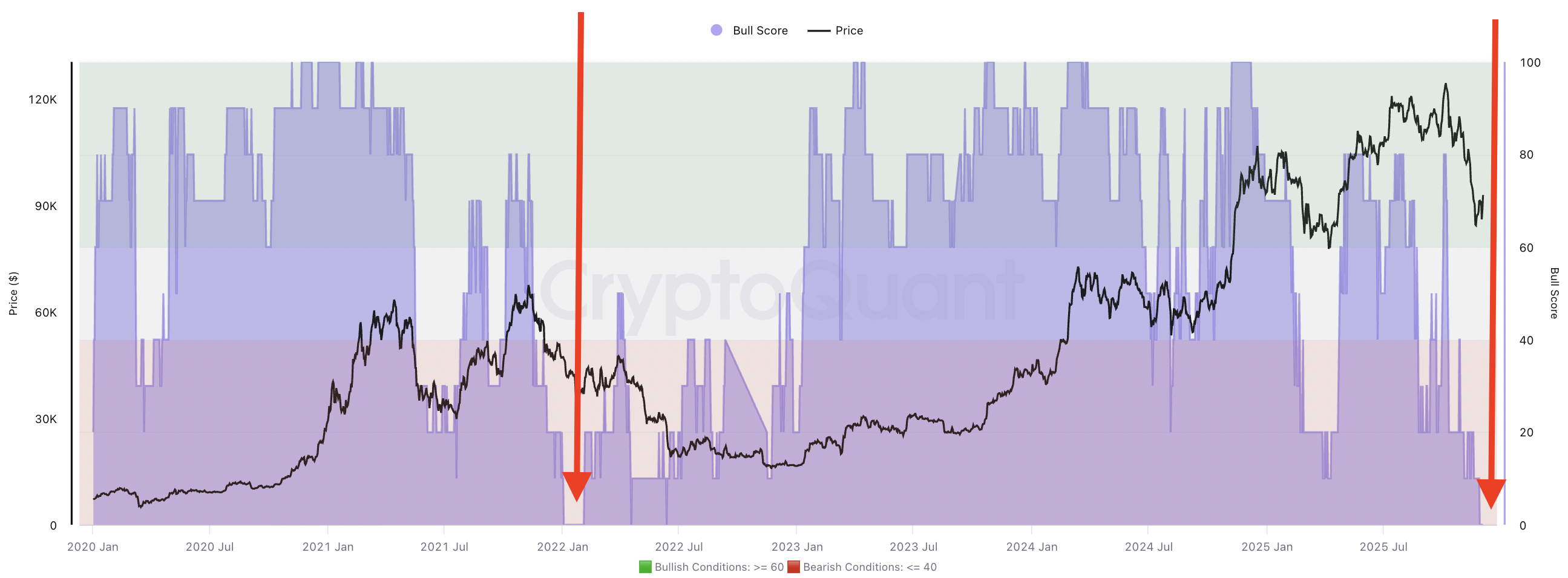 The CryptoQuant Bull Score Index shows a bearish view after dropping sharply since August, with a reading remaining flat throughout November despite short-term price volatility. Currently, it rests within the 0–20 range, signaling deep bearish conditions similar to those in January 2022 as depicted below: