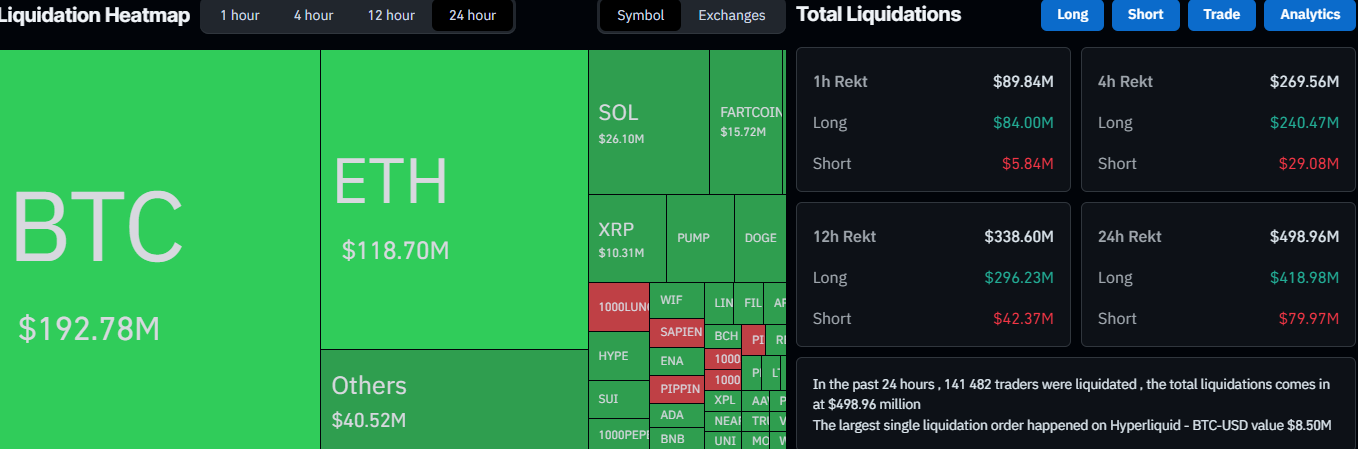 In the past 24 hours, over $500 million worth of positions were liquidated again, including $420 million in long positions. Over 140,000 traders were impacted, with the largest liquidated order valued at $8.5 million.