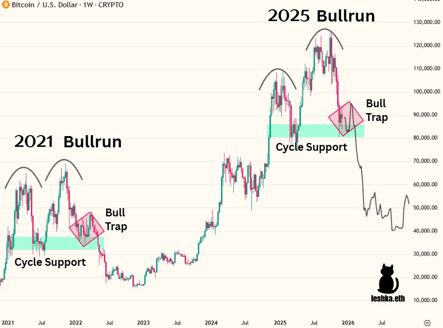 Analyst Leshka noted that Bitcoin’s current trajectory closely resembles that of the 2021 cycle, potentially foreshadowing a significant drop to $40,000 by early 2026 if these patterns repeat. Similarly, analyst Alex Wacy corroborated this viewpoint, warning of substantial corrections following past trends.