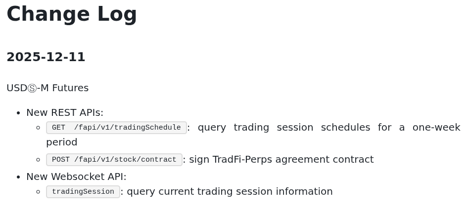 In the changelog released by Binance, it was noted that three new API endpoints were added. One of these, featuring a URL structure that includes stock/contract, allows users to ‘sign a TradFi-Perps agreement contract.’ The other endpoints facilitate querying trading session schedules for a week and current trading session details, hinting at planned trading sessions similar to traditional finance rather than the continuous trading offered in cryptocurrency markets.
