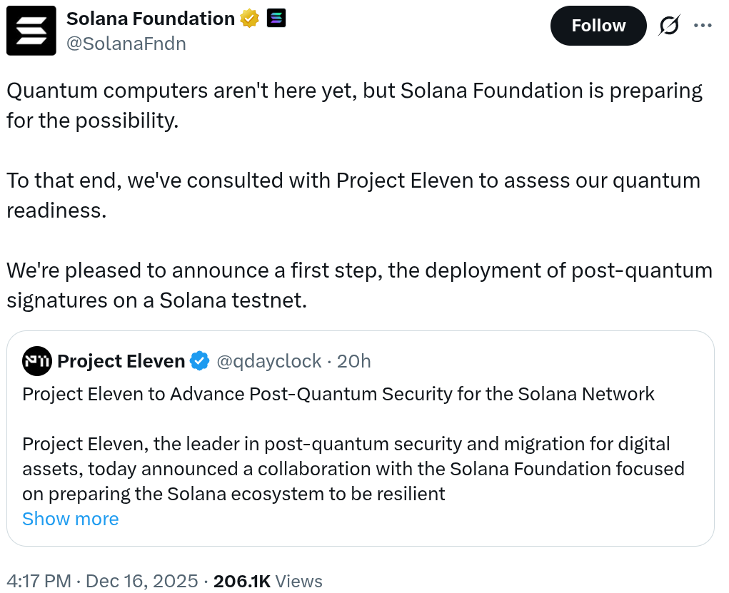 This announcement comes as Project Eleven conducted a comprehensive threat assessment regarding quantum computing on Solana, creating a working prototype on the testnet that uses post-quantum digital signatures. The outcome illustrated that “end-to-end quantum-resistant transactions are both feasible and scalable.”