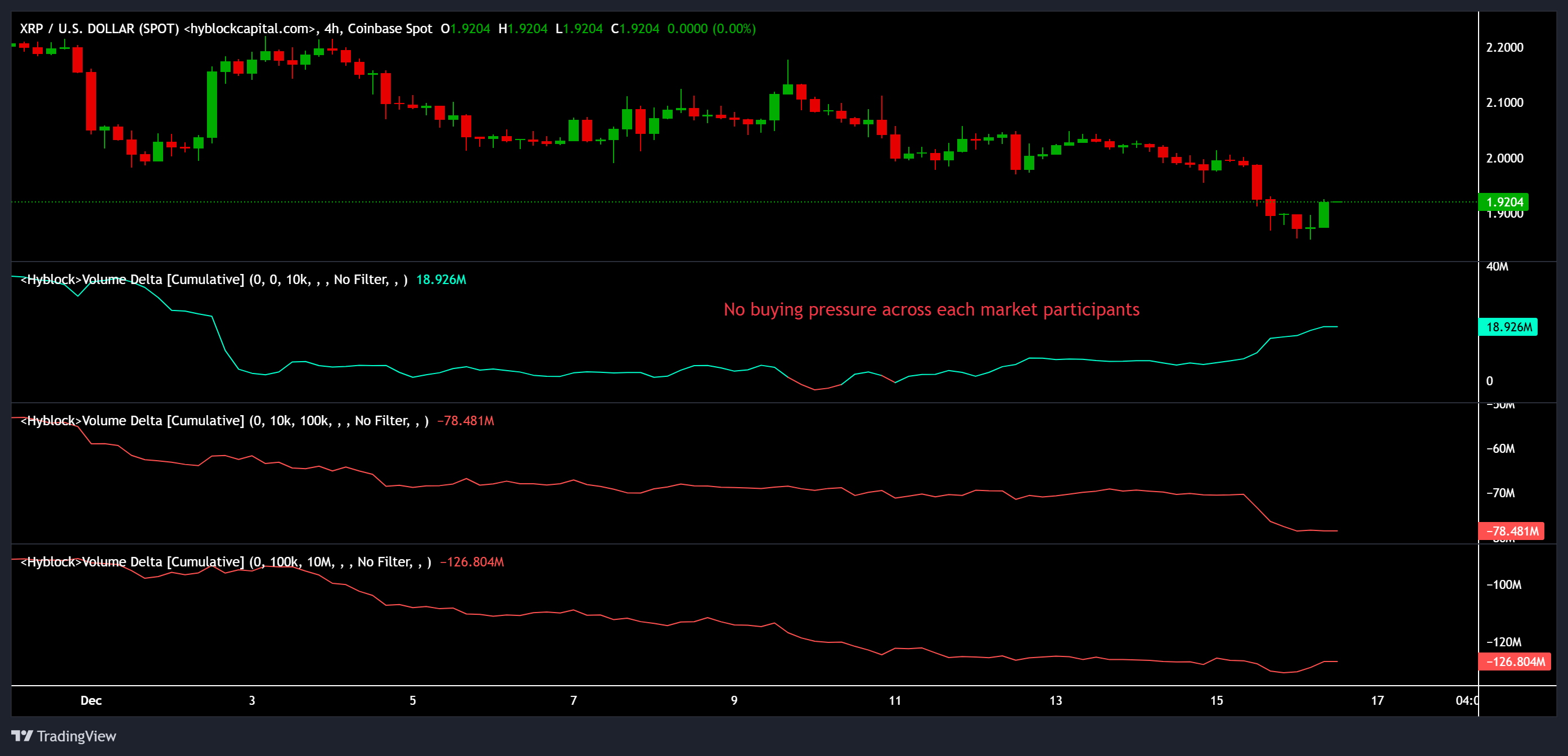 XRP four-hour chart volume delta cumulative. Source: Hyblock Capital