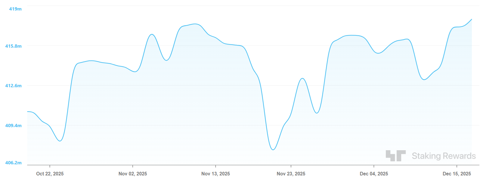 Furthermore, the native staking on Solana contributes to limiting available SOL for sale. Currently, almost 68% of circulating supply is delegated to the network’s proof-of-stake mechanism, an increasing trend observed over recent months. Staking yields on Solana can surpass 6% as the supply remains inflationary to cover validator operating costs.