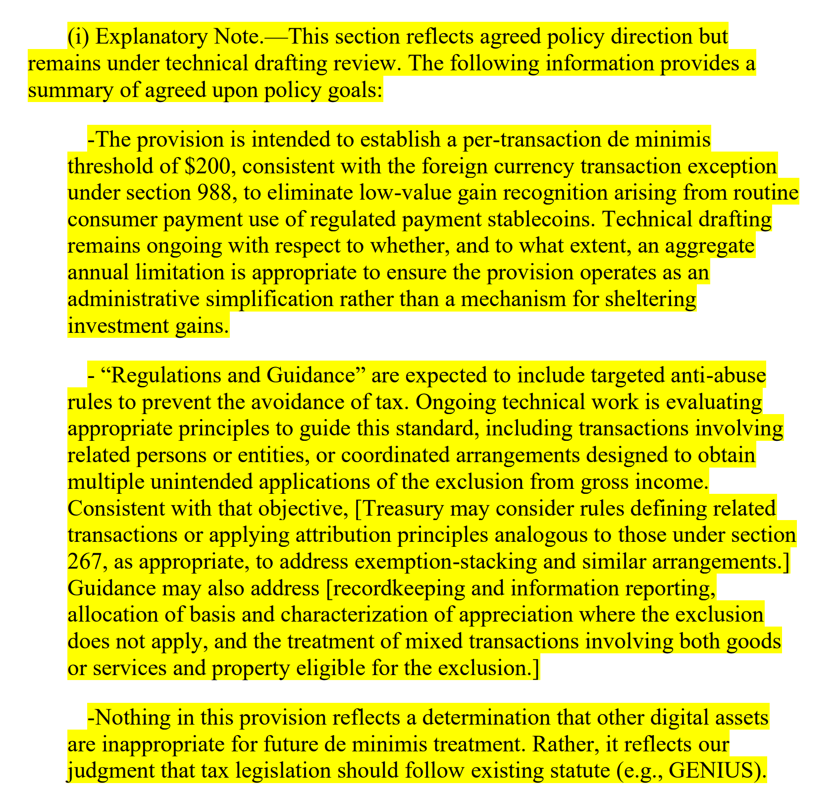 The measure includes provisions to prevent misuse. The exemption will not apply if a stablecoin fluctuates outside a specified price range, and the benefits will not extend to brokers or dealers. Additionally, the Treasury would be empowered to impose anti-abuse regulations and reporting protocols.