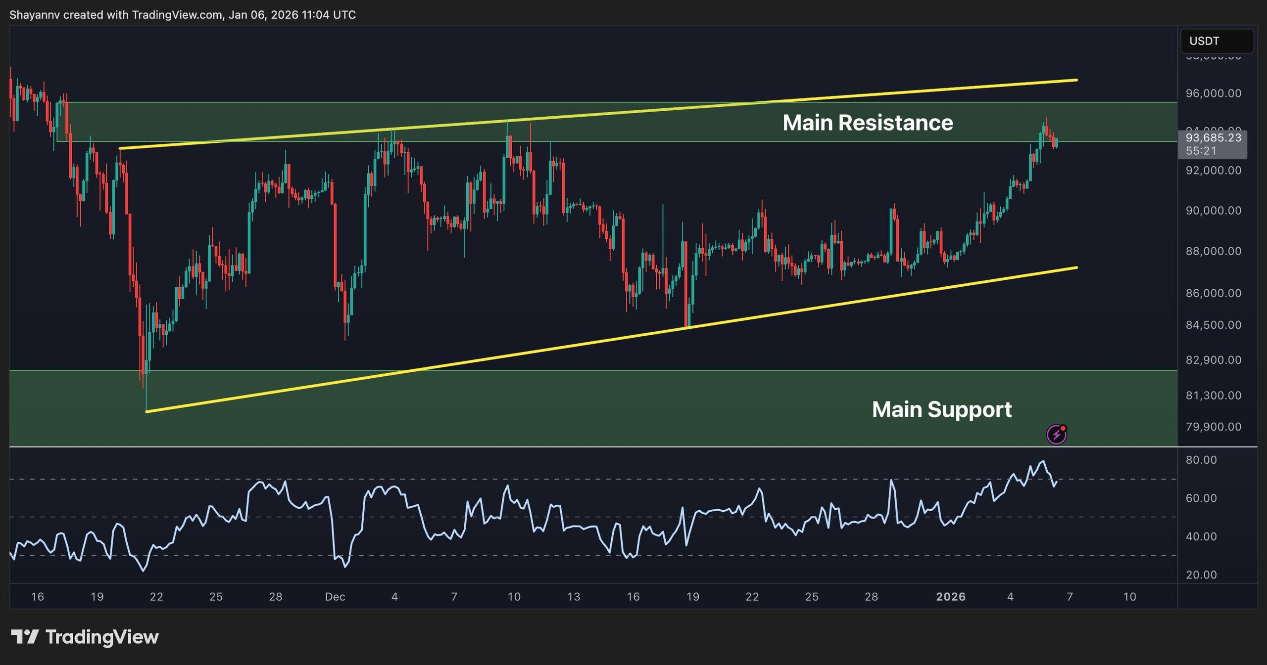 The 4-hour chart reveals a clear upward channel, with Bitcoin consistently achieving higher lows since mid-December. The price currently approaches the upper boundary of this channel, coinciding with the same $93,000 to $95,000 resistance noted in the daily analysis. This intersection might provoke a short-term price rejection or consolidation.