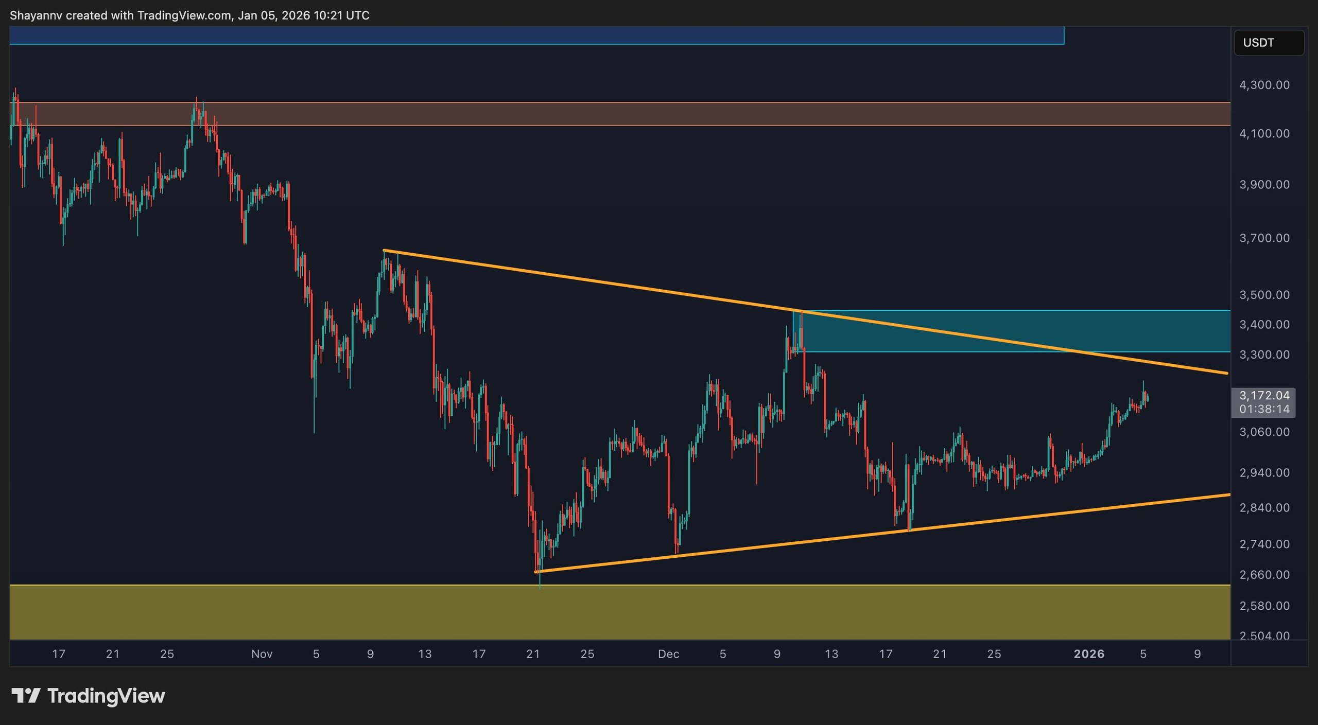 Simply consolidating is insufficient to indicate a bullish continuation. A clear breakout above the wedge at $3,400, ideally with strong movement and acceptance, is required to affirm renewed bullish momentum. Until this happens, the current price movement should be viewed as corrective within a narrow range, with heightened risk of another rejection if resistance holds.