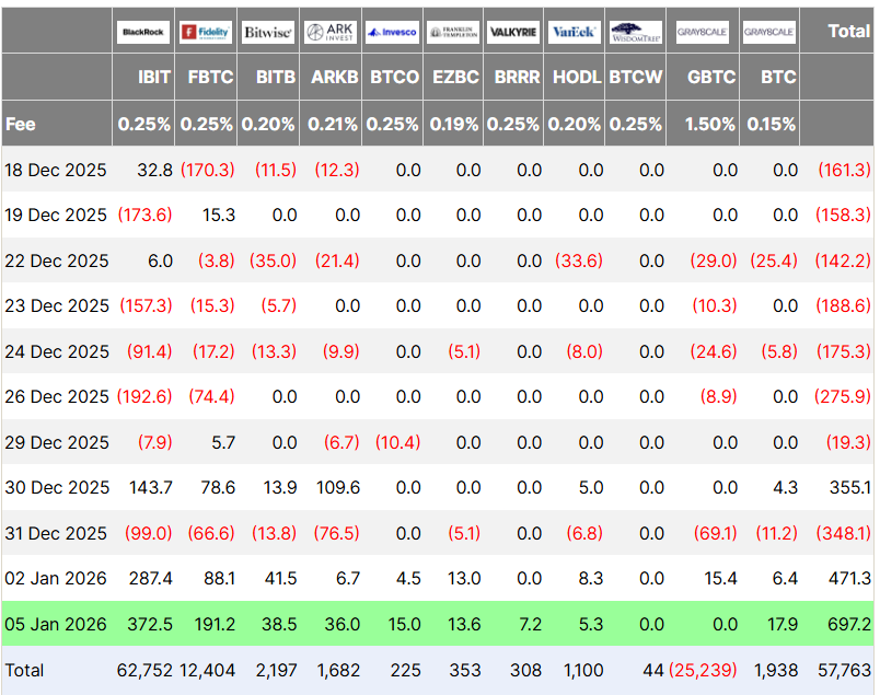 On January 4, 2026, U.S. spot Bitcoin ETFs attracted $697 million in inflows, contributing to a total of over $1.1 billion in net positive inflows within the first two days of trading, as reported by Farside Investors.