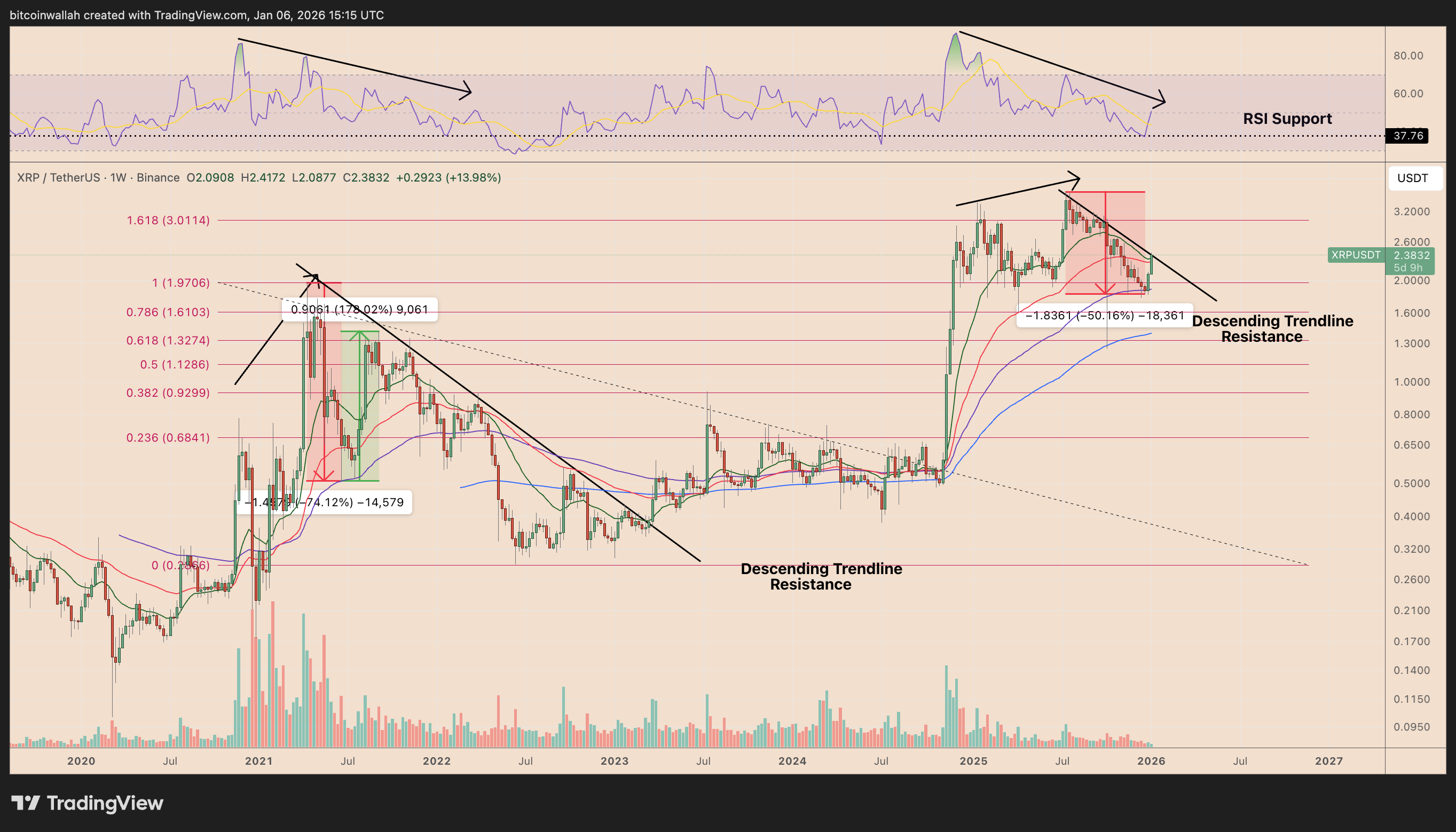 Nevertheless, these movements didn’t alter the overarching trend, as the price remained constrained by a descending trendline. As it currently stands in 2026, XRP continues trading below this trendline and the 100-week EMA, indicating that the bear market may not be entirely finished.
