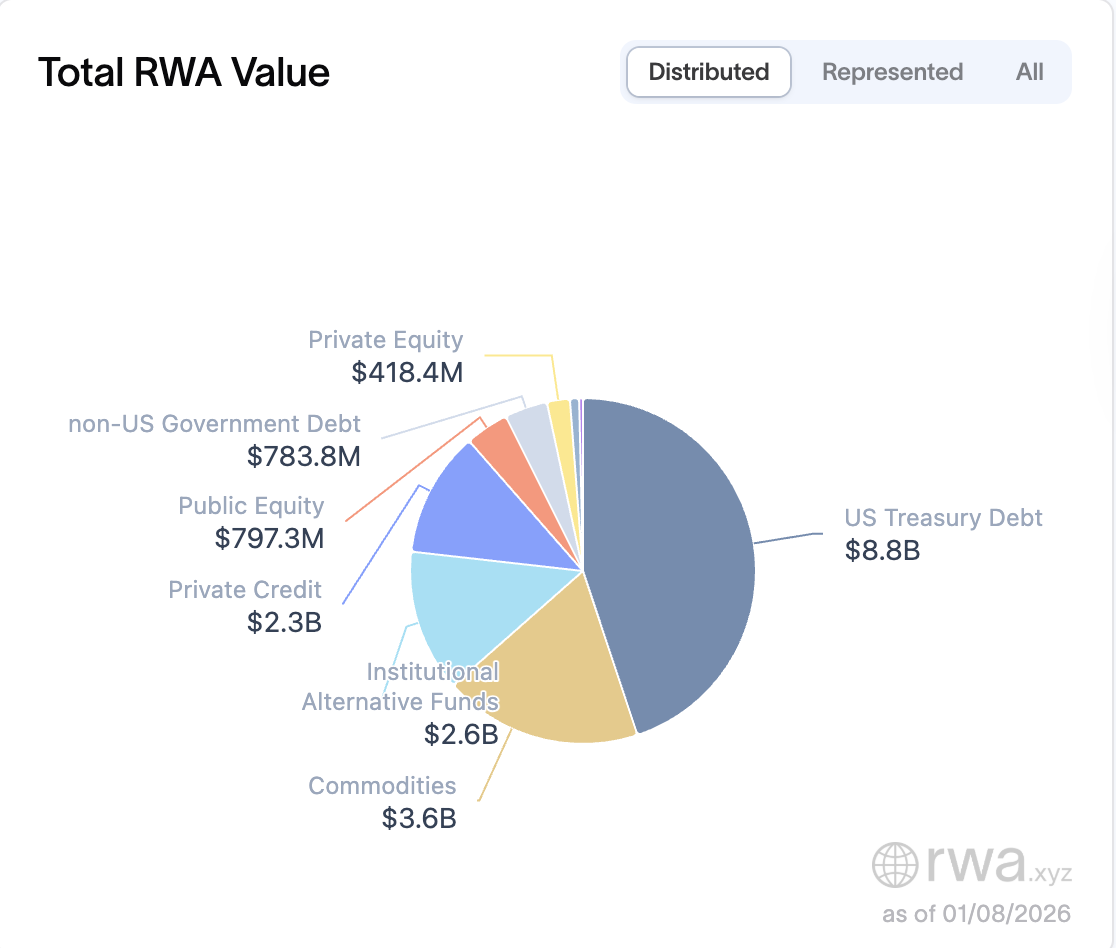 The total value of tokenized real-world assets is broken down by asset class. Source: RWA.XYZ
