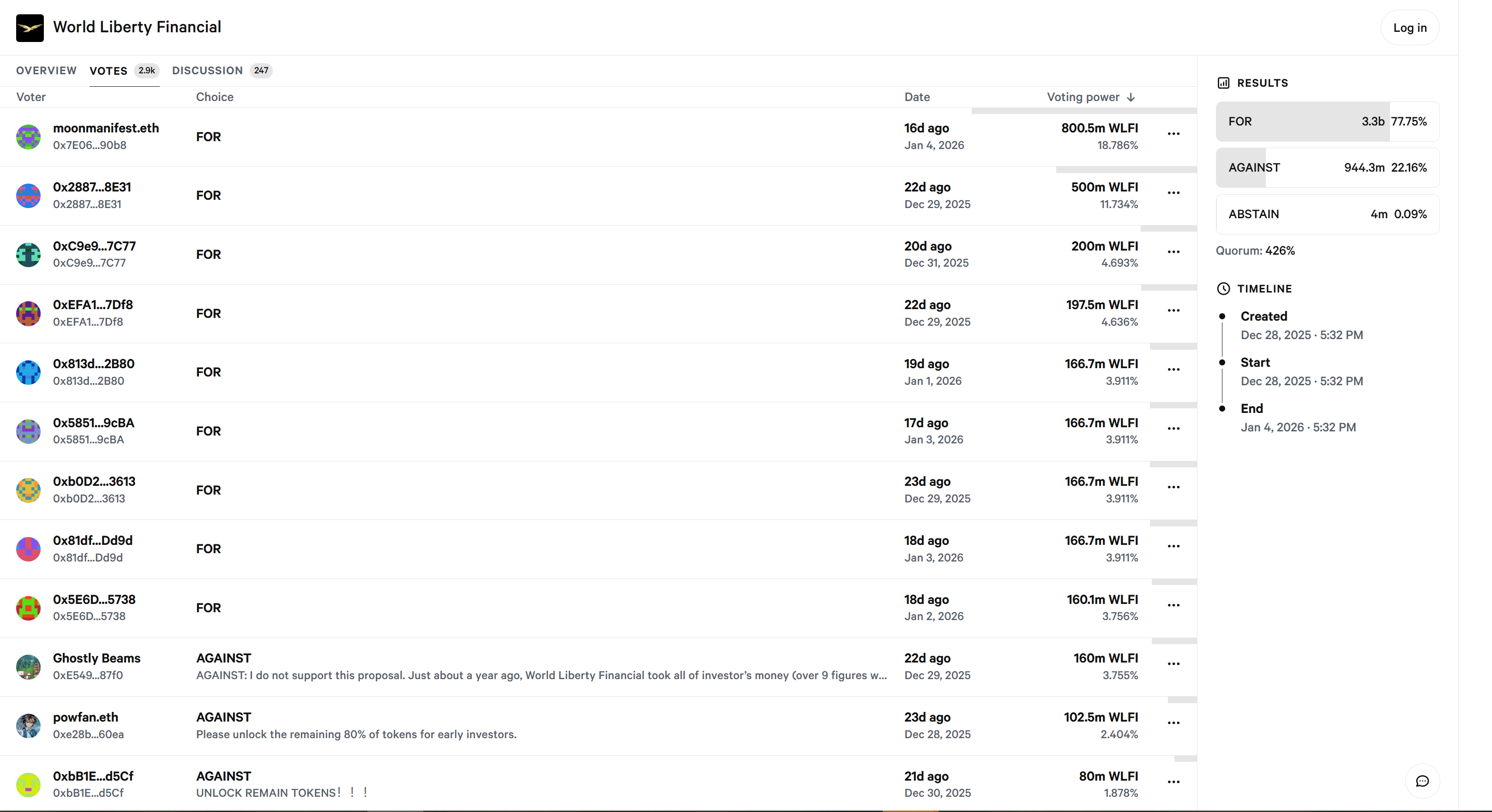 Data from the onchain voting revealed that nearly 60% of the voting influence was concentrated among nine wallets, many of which are identified as allied with the WLFI team or its strategic partners. This situation has raised significant concerns regarding the control wielded by this select group.