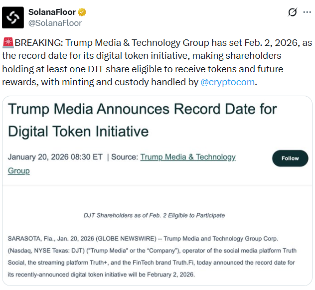 U.S. President Donald Trump’s media firm is progressing with plans for its unprecedented shareholder token distribution, marking February 2 as the essential date to confirm eligibility for digital tokens.