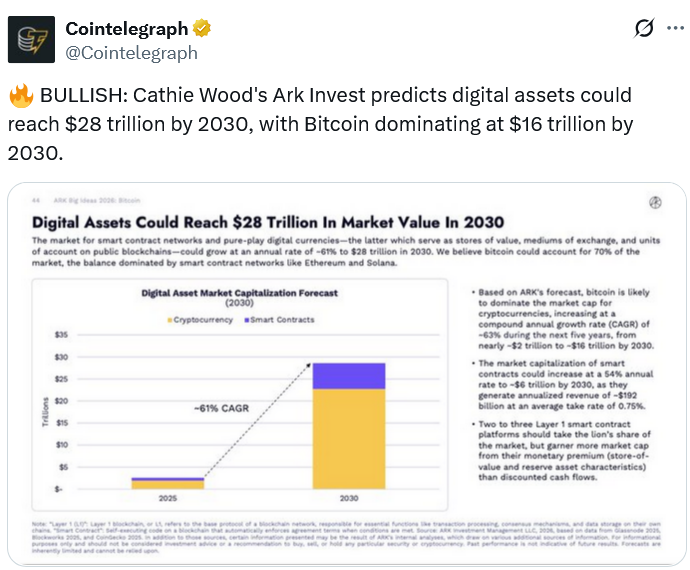 ARK detailed in their “Big Ideas 2026” report published on Wednesday that the crypto market is expected to grow at a compound annual growth rate (CAGR) of 61%, with Bitcoin slated to contribute to 70% of this growth.