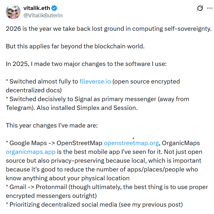 The two significant adjustments he made in 2025 include a complete transition to Fileverse, a decentralized document platform akin to a more private Google Docs, as well as an intentional shift to using Signal for communications.