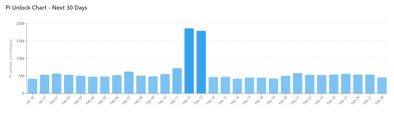 Factors contributing to PI’s decline include broader market downturns and the imminent release of a considerable amount of tokens. Over the next month, more than 180 million coins are expected to unlock, averaging about 6 million daily. The peak unlock dates are slated for February 12 and 13, when over 35 million PI will enter circulation.