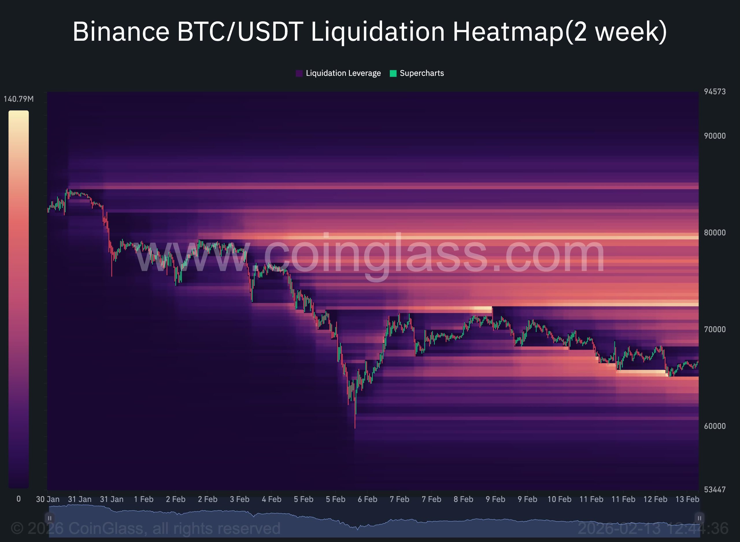 A breakout above the $72,000 resistance could speed the price toward this area, potentially triggering a short squeeze if $80,000 is breached. Conversely, liquidity is thin until the $60,000 to $62,000 region, aligning with the recent swing low.