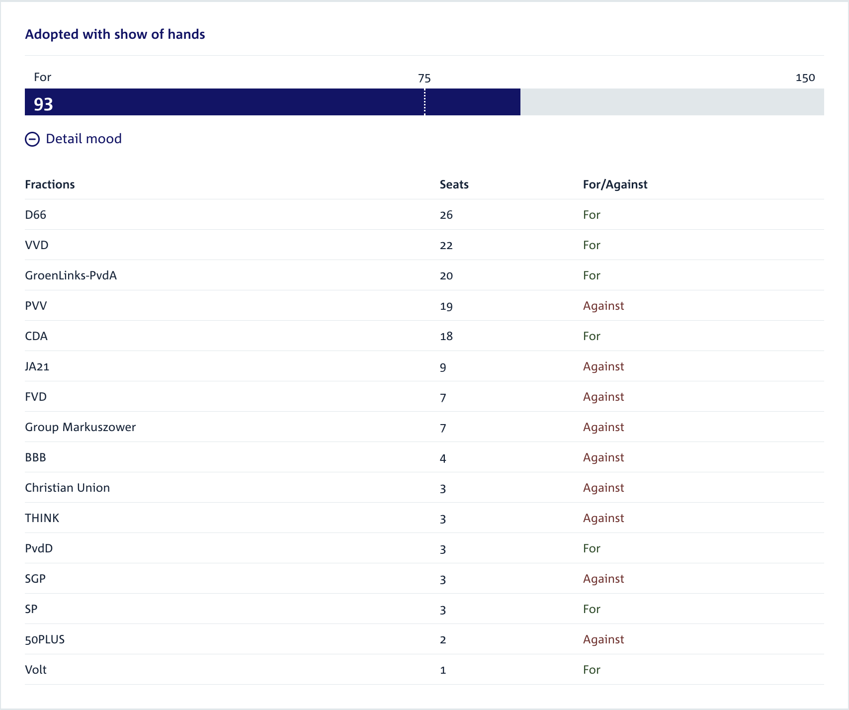The vote tally for the 36% capital gains tax bill. Source: Dutch House of Representatives