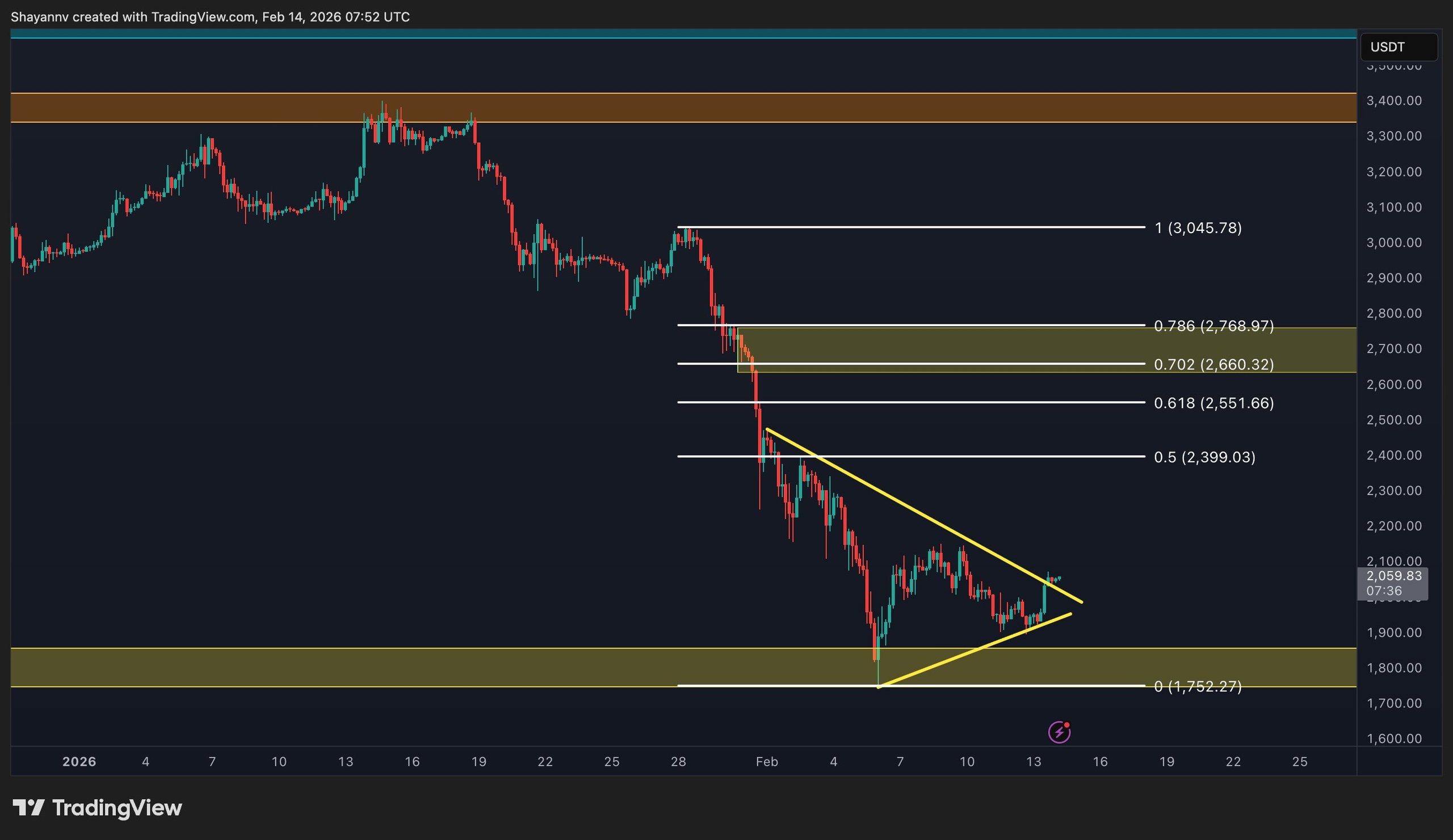 The 4-hour chart indicates that price action has molded a short-term contracting formation following a sharp rebound from $1.7K. Currently, the market fluctuates between the ascending short-term support trendline and the descending local resistance trendline, situated near the $2.1K mark. A successful breakout above $2.1K may lead to attempts at reaching $2.5K, the next key resistance.