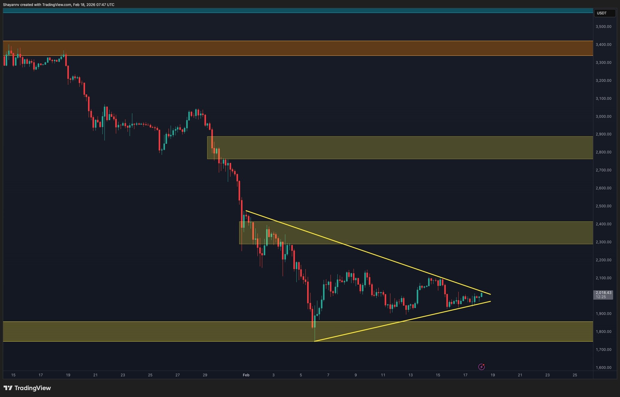 As long as price action remains within these limits, the most likely scenario is oscillation within this range. A significant breakout above the mid-channel resistance would lead to potential gains, whereas dipping below $1,800 could confirm bearish trends.