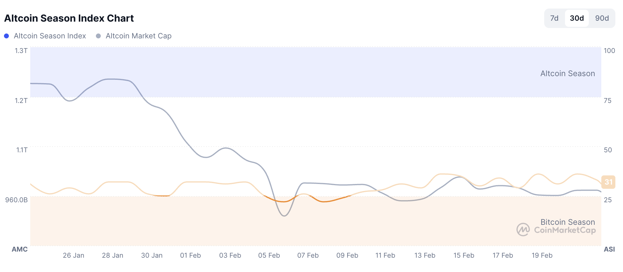 The Altcoin Season Index recorded a Bitcoin Season score of 33 out of 100 on Sunday, indicating investors are still heavily favoring Bitcoin over altcoins. Source: CoinMarketCap