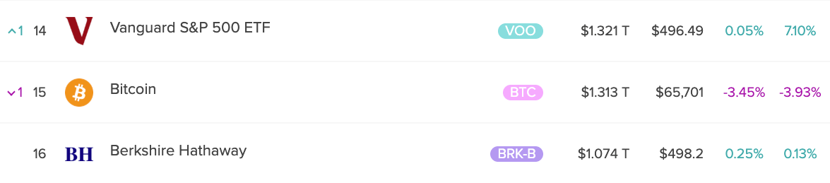 Bitcoin now sits between the Vanguard S&P 500 ETF (VOO) and Berkshire Hathaway (BRK-B) in market cap rankings. Source: 8marketcap