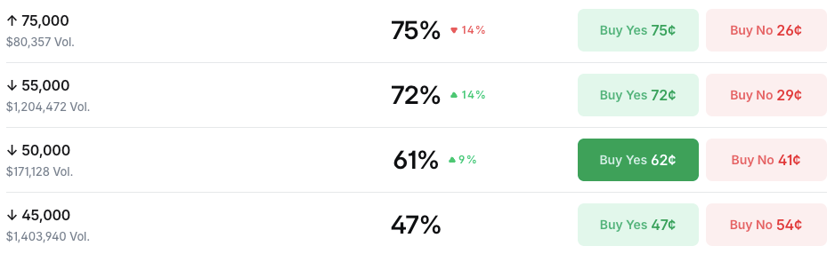 The probability of Bitcoin (BTC) falling below $55,000 has jumped to 72%, with $1.2 million in volume on the platform. Other bearish forecasts suggest price drops under $50,000 and $45,000, with respective odds of 61% and 47% and trading volumes of $170,000 and $1.4 million.