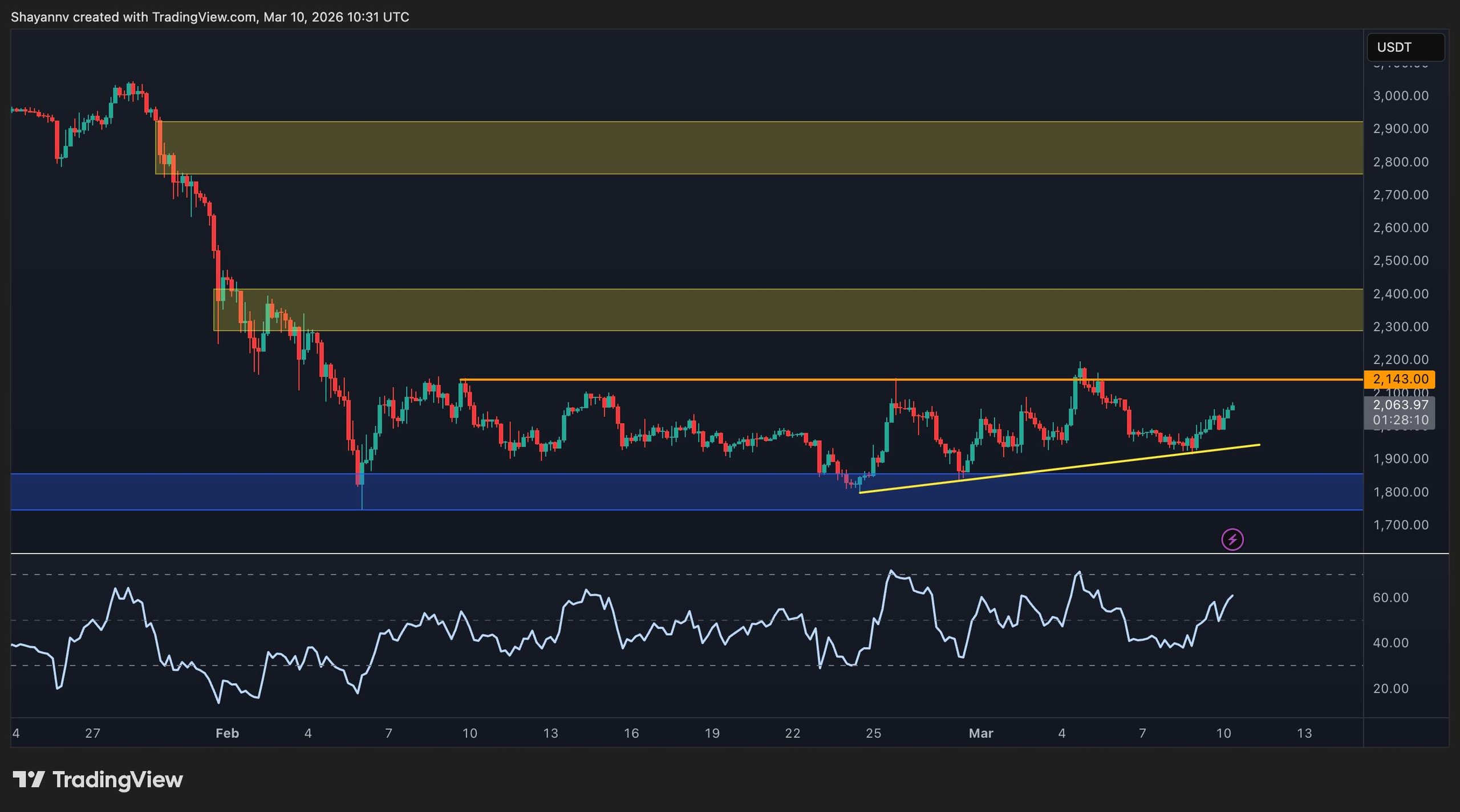 The 4-hour chart showcases ETH’s gradual ascent from the lows observed in late February, as it approaches the $2,150 resistance level again. The establishment of a rising trendline from recent swings suggests rising momentum, and the RSI has moved back above the midpoint, supporting the argument for a more robust recovery effort.